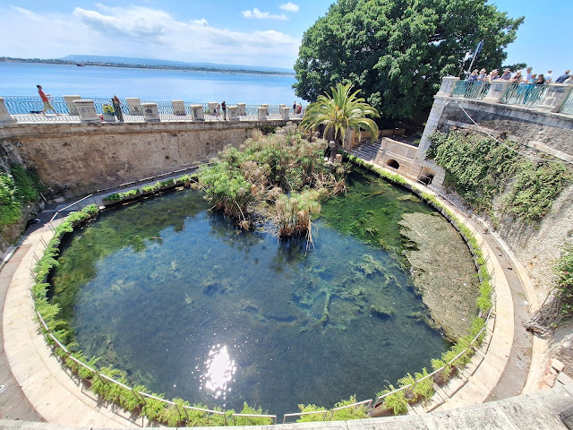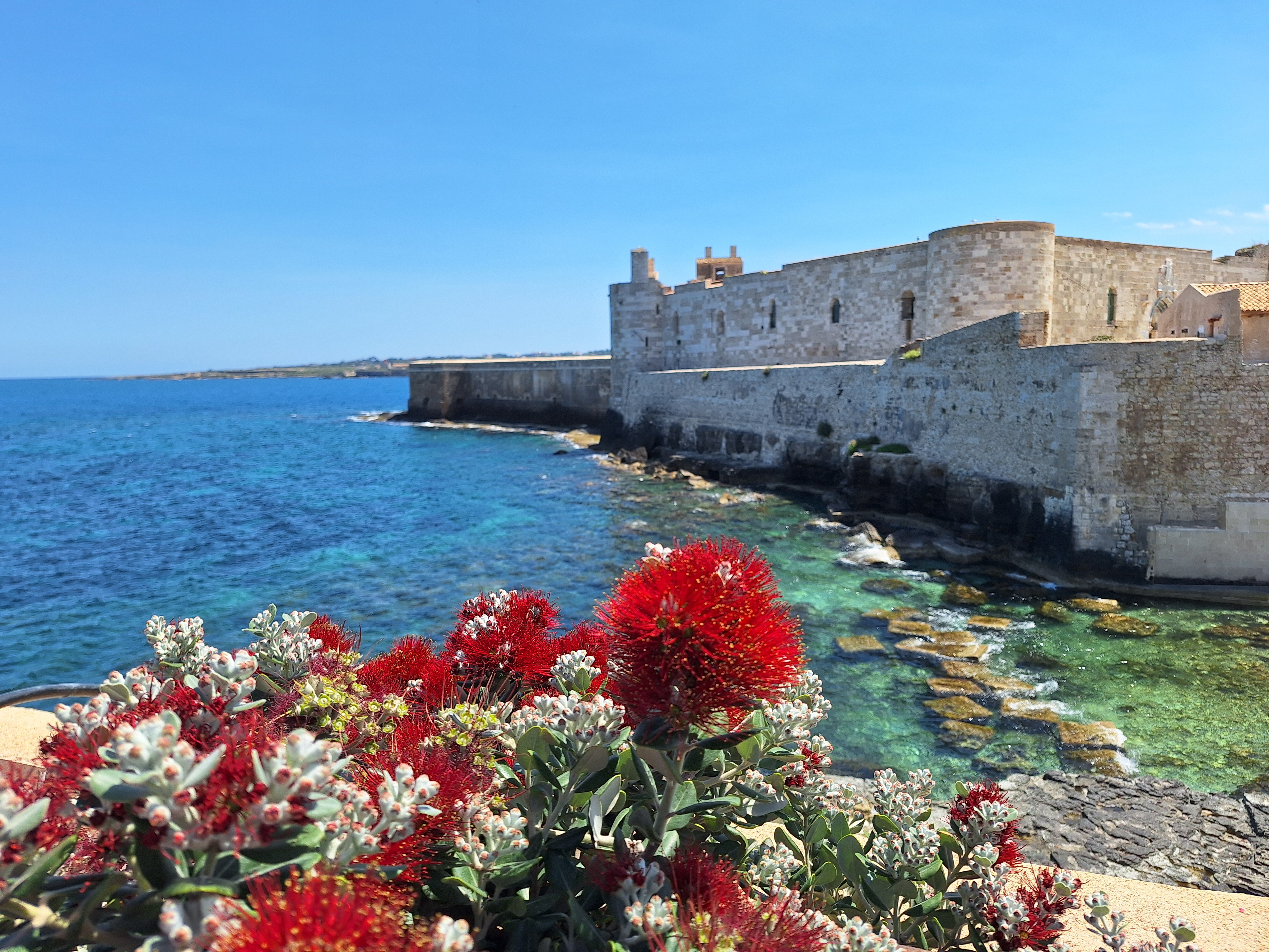 Nie możemy jednak pominąć obowiązkowych punktów programu. Wchodzimy zatem na koronę XVI-wiecznego fortu San Giovanello, dostrzegając stamtąd hotel o swojsko brzmiącej nazwie ,,Gutkowski". Okazuje się, że chodzi o legionistę Piłsudzkiego, męża markizy Cassibile, Marii Emanueli Loffredo Pulejo. Relaksujemy się na pocztówkowej Spiaggia di Cala Rossa. Wędrujemy na sam koniec cypla, do XIII-wiecznego Castello Maniace, obsadzonego dookoła kwitnącym na czerwono metrosiderosem. Odszukujemy punkt widokowy, któremu patronuje Enzo Maiorca (pierwowzór Enza Molinariego z ,,Wielkiego Błękitu"). Wypatrujemy dzikiego papirusa rosnącego przy Fonte Aretusa. Odpoczywamy w cieniu ogromnych figowców bengalskich w Giardino Aretusa. Schładzamy się przy fontannie Diany na Placu Archimedesa. Zastanawiamy się czy wybrać ceramiczną ośmiornicę czy raczej którąś z równie misternie wykonanych malowanych rybek. W końcu weźmiemy te smażone, podane z ćwiartką cytryny...